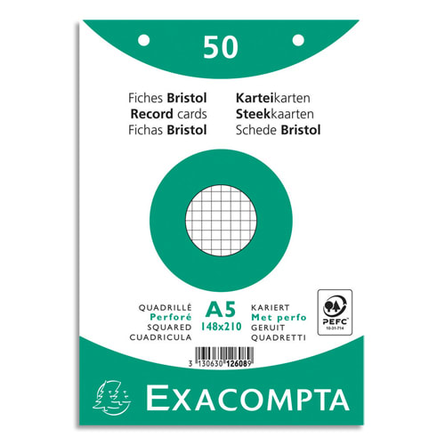 EXACOMPTA Sachet de 50 fiches bristol (sous-film) perforées 148x210mm (A5) quadrillées 5×5 Blanc