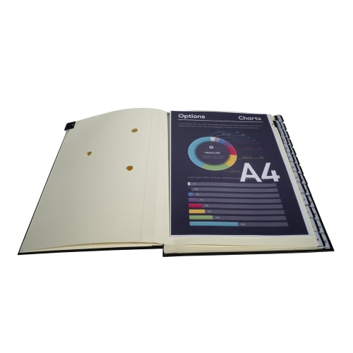 Couverture plastifiée collée-rembordée. Intérieur en carte Ivoire 300 g, perforé 3 trous. Dos extensible. Cavaliers plastiques, à effet loupe.