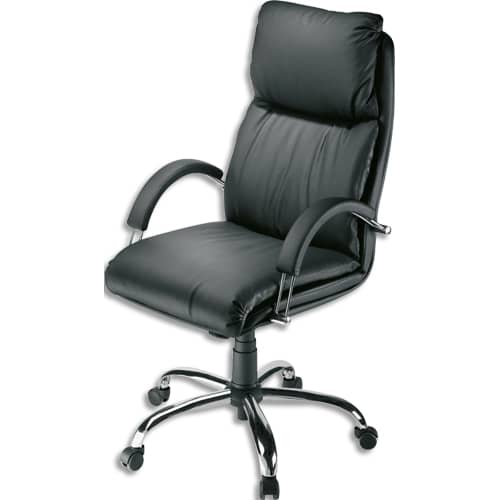 Dossier et assise en croûte de cuir de bovin pigmenté Noir. Rembourrage mousse densité 30 kg/m3. Double coussinage, coussin appui-tête, accoudoirs en croûte de cuir et piètement chromé. Assise réglable en hauteur par vérin pneumatique. Mécanisme basculant centré réglable en intensité et blocable.