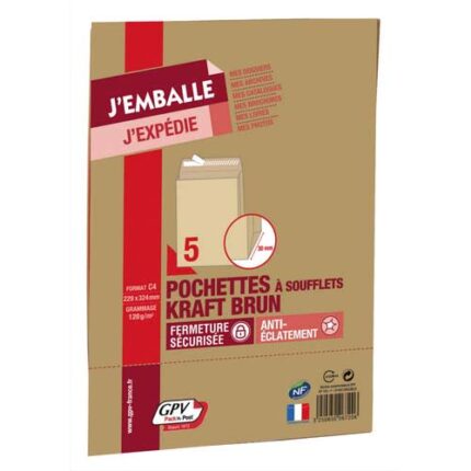 GPV paquet de 5 pochettes kraft brun auto-adhésif, format C4 229x324mm soufflet 30mm 120g