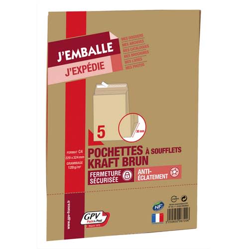 GPV paquet de 5 pochettes kraft brun auto-adhésif, format C4 229x324mm soufflet 30mm 120g