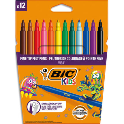 BIC KIDS Visa Feutres de Coloriage à Pointe Fine – Couleurs Assorties, Etui Carton de 12
