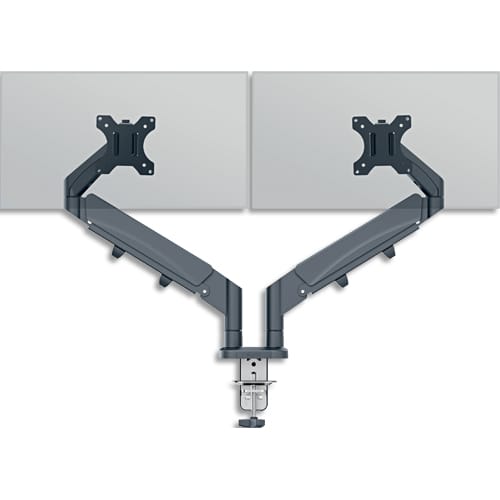 Support double pour écran de PC de 17 » à 32 » (9 kg max). Peut être pivoté à 180° et incliné à environ 90°, es 2 écrans sont ajustables séparément. Installation facile avec une plaque VESA et une pince en C caoutchoutée en silicone pour réduire les vibrations et protéger la surface du bureau. Coloris gris.
