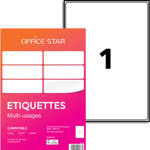 OFFICE STAR Boîte de 100 étiquettes multi-usage Blanches 199,6 x 289,1 mm OS43440