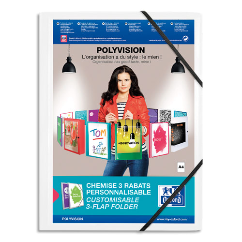 OXFORD Chemise 3 rabats et élastique personnalisable Polyvision en polypro 5/10e. A4. Blanc opaque