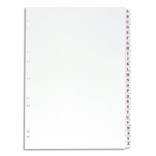 En PVC rigide 19/100e Blanc. Page de garde personnalisable et imprimable. Perforation 11 trous. Alphabétiques A-Z, 26 touches.