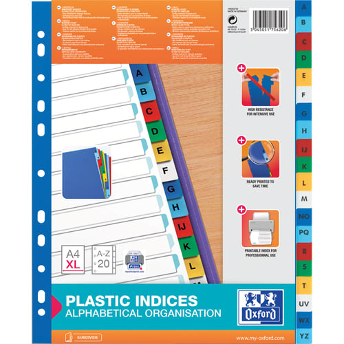OXFORD Intercalaire alphabétique, en polypropylène 12/100e, 20 positions, format A4+. Assortis