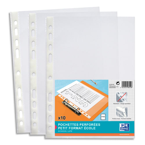OXFORD Sachet de 10 pochettes perforées en polypropylène lisse 6/100e.Format 17x22cm, perforation 9 trous