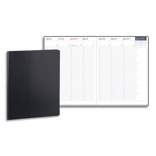 Couverture en PVC expansé grain cuir. Flap marque-page. Quart d’heure, 1 semaine/2 pages. 128 pages. Format : 24 x 32 cm. Noir.