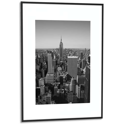 Cadre de finition en aluminium anodisé ou laqué Noir de 9 mm et fond rigide en médium de 3 mm. Support 100% plexiglas (PPMA). Livré monté.
