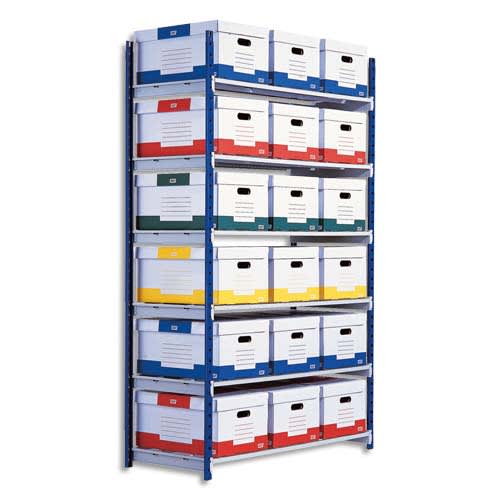 Structure et tablettes à claire-voie en acier finition peinture époxy Gris et Bleu. Embouts plastiques à la base des montants. Largeur des tablettes : 100 cm. Tablettes réglables en hauteur tous les 5 cm. En option : plateaux Isorel pour tablettes. Supporte jusqu’à 180 kg par tablette. Montage facile sans outils ni vis. Système breveté de fixation des tablettes pour une stablilité incomparable.