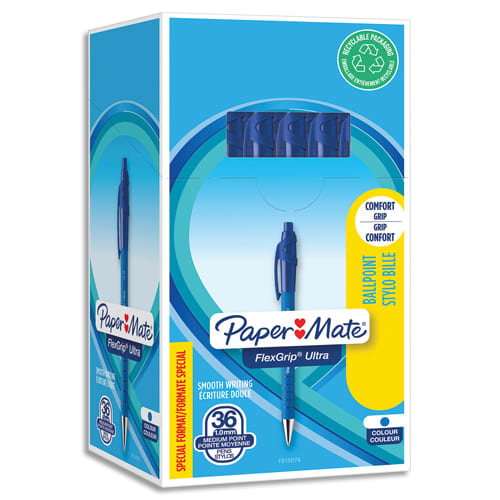 PAPERMATE Pack de 30+6 Stylo à bille pointe moyenne rétractable corps caoutchouc FLEXGRIP Bleu