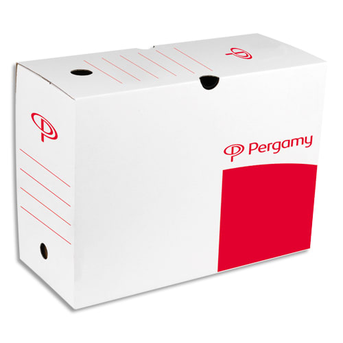 PERGAMY Boîte archive dos 20 cm. Montage automatique. Kraft ondulé. Blanc imprimé rouge