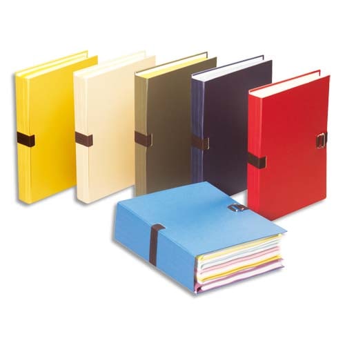 Couverture en papier grainé. Fermeture à sangle Noire et boucle nickelée à coulisseau cranté. Dos extensible jusqu’à 13 cm. Sans rabat en pied.