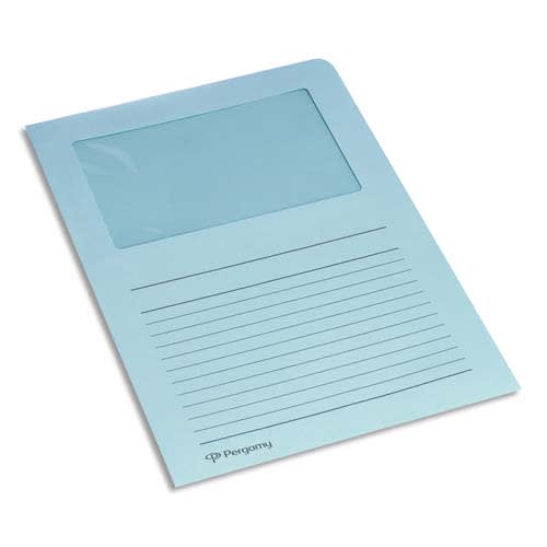 PERGAMY Paquet 100 pochettes coin en carte 120g avec fenêtre. Dimensions 22 x 31 cm. Coloris Bleu clair