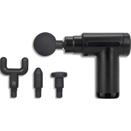Sans fil. Permet de soulager les tensions musculaires. 4 têtes de massage interchangeables pour les différentes parties du corps (bras, dos, hanches, cuisses, mollets). 6 vitesses de 1700 à 3000 rpm avec indicateur LED. Batterie rechargeable 1200 mAh, autonomie 40 min. Pochette de transport incluse. Câble de chargement USB-Type C inclus. Matière : ABS. Puissance : 24W.