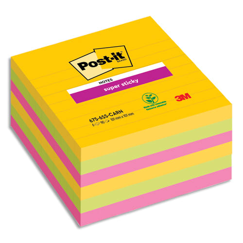 POST-IT Lot de 6 blocs 90F Super Sticky CARNIVAL lignées 101×101 mm, Jaune néon, Fuchsia, méditerranée