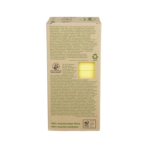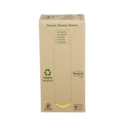 La note Post-it® 100% écologique, papier 100% recyclé. Sans emballage individuel, tour distributrice en carton recyclé d’une seule couleur pour faciliter le désencrage. Tour composée de blocs de 100 feuilles Jaunes.