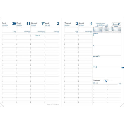 Agendas fonctionnels et résistants. Couverture amovible avec un grain esprit maroquinerie. EU 09/09. Août à Août. 1 semaine/2 pages. De 8h à 21h, tranche RDV par 1/4 heure. Noir – Format : 21 x 29,7 cm.