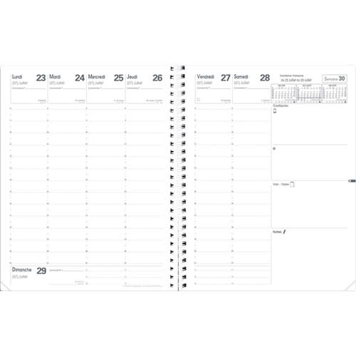 Agendas fonctionnels et résistants. Couverture amovible avec un grain esprit maroquinerie. Président spiralée. Août à Août. 1 semaine/page. Répertoire. De 8h à 21h, tranche RDV 1/4 heure. Noir – Format : 21 x 27 cm.