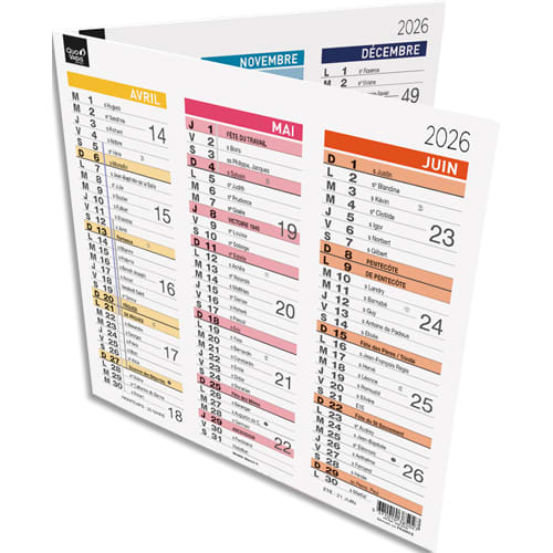 Calendrier pliable et dépliable, avec 3 mois sur chaque face. 12 mois de Janvier à Décembre. Vacances scolaires par zone et dimanches/jours fériés en couleurs. Coloré. Format : : 36 x 18 cm (déplié).