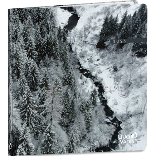 Agendas en papier recyclé. Couverture imprimée avec pelliculage mat et vernis relief transparent. Exécutif. Format : 16 x 16 cm. 1 semaine/2 pages. De Décembre à Décembre. De 8h à 20h, tranche RDV par heure. Neige.