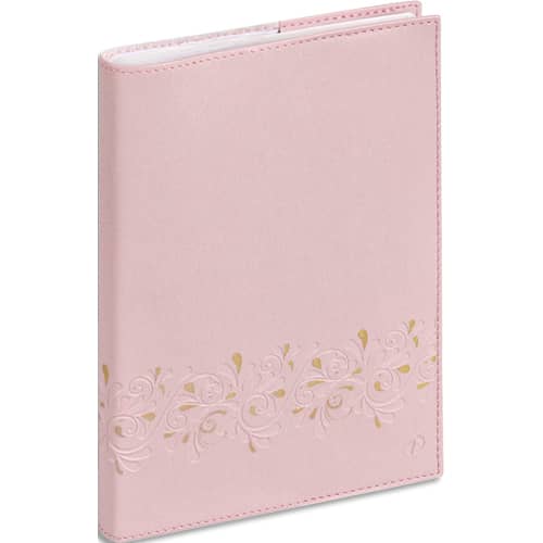Agendas féminins élégants. Couverture amovible au toucher textile et aux motifs délicats dorés et marqués en creux. Grille colorée. Grande zone de notes et to do. Ministre Color. Format : 16 x 24 cm. De Décembre à Décembre. 1 semaine/2 pages. De 8h à 20h, tranche RDV par heure. Arabesque.