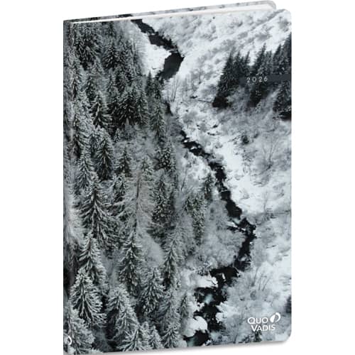 Agendas en papier recyclé. Couverture imprimée avec pelliculage mat et vernis relief transparent. Ministre. Format : 16 x 24 cm. 1 semaine/2 pages. De Décembre à Décembre. De 8h à 21h, tranche RDV par 1/2 heure. Neige.