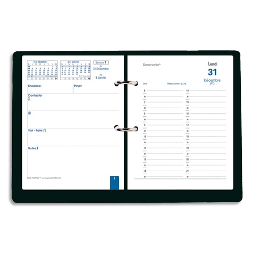 Recharge bloc éphéméride de bureau journalier. Socle en plastique avec 2 anneaux métalliques. De Janvier à Décembre. 1 jour sur 2 pages avec date et prise de RDV sur la page de droite + page de notes sur la page de gauche. De 6h à 21h30. Tranche RDV par ¼ heure. Recharge seule. Format : 11,5 x 14,5 cm.