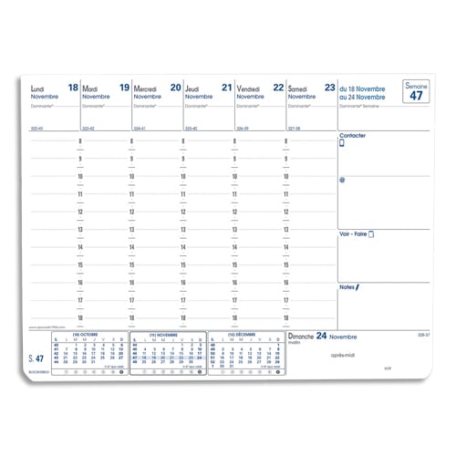 Recharge bloc éphéméride de bureau à vue hebdomadaire. Contient 56 feuillets détachables imprimés en recto et encollés en tête. De Janvier à Décembre. 1 semaine sur 2 pages. De 8h à 18h. Tranche RDV par 1/4 heure. Recharge seule. Format : 19,6 x 14,5 cm.