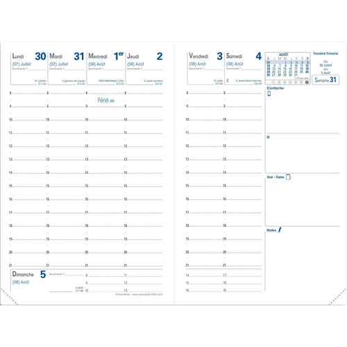 Agendas fonctionnels et résistants. Couverture amovible avec un grain esprit maroquinerie. Universitaire. Août à Août. 1 semaine/2 pages. Répertoire. De 8h à 21h, tranche RDV par 1/2 heure. Noir – Format : 10 x 15 cm.
