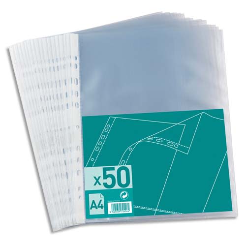Sachet de 50 pochettes perforées en polypropylène grainé 4/100. Format A4, 11 trous.