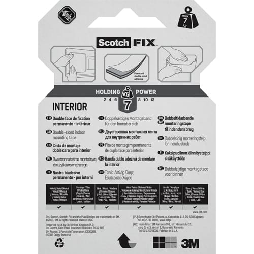 Adhésif double face mousse polyuréthane. Fixation intérieure. Fort pouvoir adhésif jusqu’à 900 g, même en environnement humide.