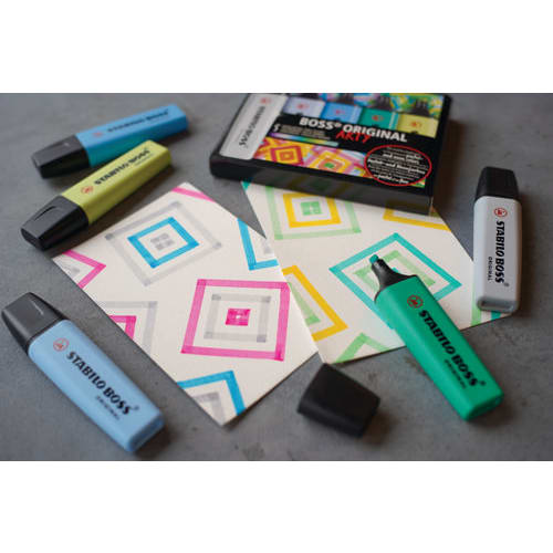 Étui ARTY de 10 surligneurs STABILO BOSS ORIGINAL couleurs froides. Avec ses 10 nuances froides pastel et fluo, STABILO BOSS ORIGINAL devient un véritable instrument de création sur papier, pour dessiner, colorier ou décorer… La pointe biseautée du surligneur BOSS offre 2 largeurs de tracé de 2 et 5 mm qui permet de réaliser des lignes de différentes épaisseurs ou de remplir de grands aplats de couleur. Les surligneurs STABILO BOSS ORIGINAL sont dotés d’une encre transparente à base d’eau qui permet de réaliser des mises en valeur mais également de superposer les couleurs. Ses couleurs fluo et ses teintes pastel apporteront la variété de couleurs nécéssaires à vos réalisations. Son utilisation est parfaite pour vos activités créatives telles que le lettering ou le bullet journal.