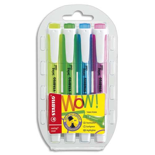 STABILO swing cool surligneur pointe biseautée – Pochette de 4 surligneurs fluo – Jaune/Bleu/Vert/Rose