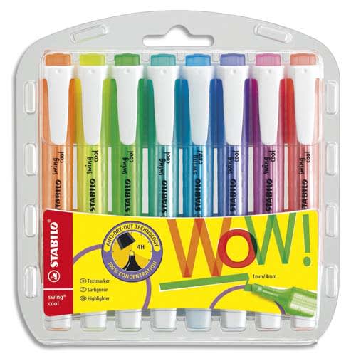 STABILO swing cool est le surligneur scolaire incontournable. Doté d’un corps fin format »stylo », le surligneur STABILO swing cool se glisse facilement dans la trousse ou dans le sac. Ce surligneur fluo possède une pointe biseautée polyvalente, qui permet à la fois de souligner, encadrer de façon précise (tracé 1 mm) et de surligner de plus grandes surfaçes (tracé 4 mm). Disponible en 8 couleurs fluos intenses, le surligneur STABILO swing cool est idéal pour mettre en valeur les informations essentielles sur vos cours ou vos fiches de révision. Fabriqué en Allemagne et doté d’une encre à base d’eau, le surligneur STABILO swing cool possède une technologie anti-dessèchement lui permettant de rester ouvert 4 heures sans sécher sans avoir à remettre le capuchon.