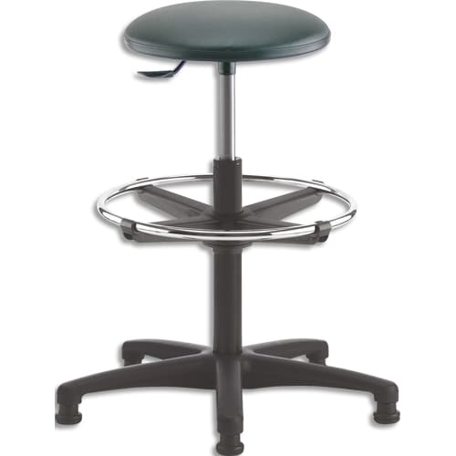 Tabouret haut avec repose-pied acier chromé sur patins Assise réglable en hauteur par vérin pneumatique.