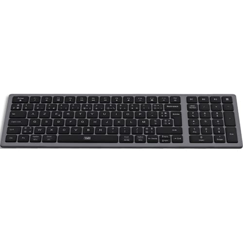 iClick Clavier Bluetooth rechargeable ultra fin. Design ultra fin et couleur grise aux reflets bleus profonds Forme compacte, recommandée par les ergonomes car elle minimise le déplacement des mains, tout en conservant la praticité d’un pavé numérique complet Touches multifonctions pour une utilisation Windows et macOS 13 raccourcis multimédias Réglage de la luminosité et du volume PC Touches ultra fines confortables Câble de charge USB-C inclus. Alimentation : Batterie intégrée 360mAh. Connectivité : Bluetooth 5.0. Type : AZERTY Dimensions : L 37 x P 12.5 x H 2 cm. Coul. gris bleu.