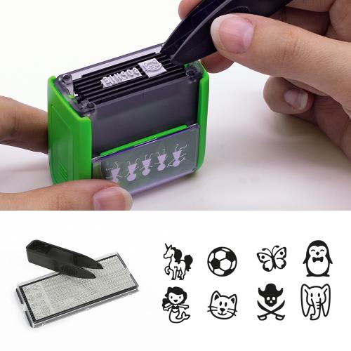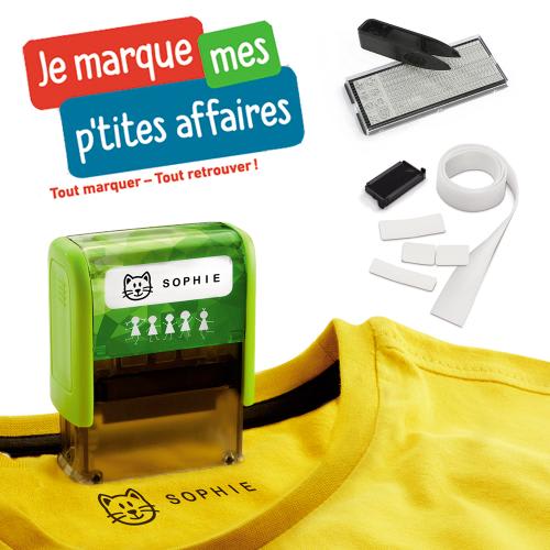 Ce kit comprend un tampon, un ensemble de lettres, 8 dessins, une cassette d’encre noire, 36 étiquettes résistantes au lavage et un mètre de bande thermocollante.