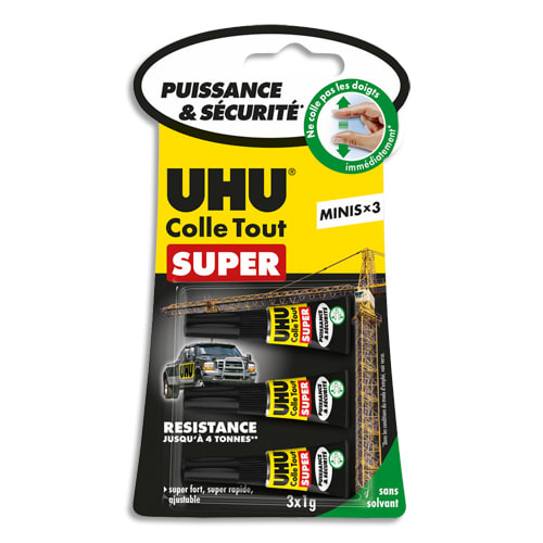 UHU Boîte antichoc de 3 mini-tubes 1g de colle Strong and Safe. Sans solvant.