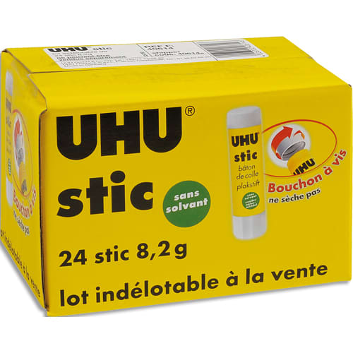 UHU Boîte de 24 stics de colle blanche de 8,2g. Sans solvant. Lavable à l’eau. Boîte indélotable