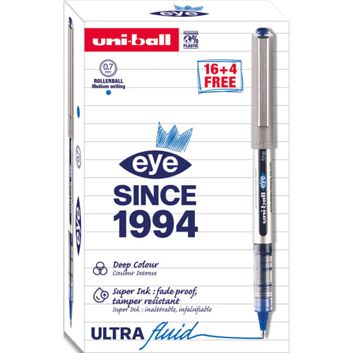 UNI-BALL Boîte de 12+4 rollers Eyes à encre liquide. Pointe en acier inoxydable 0,7 mm. Bleu