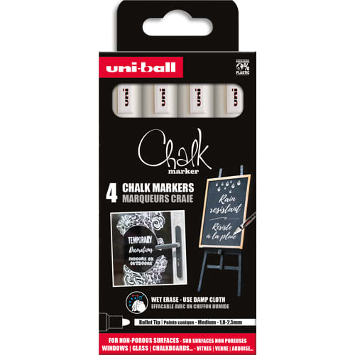UNI-BALL Set de 4 marqueurs craie CHALK MARKER. Pointe moyenne. Coloris blanc
